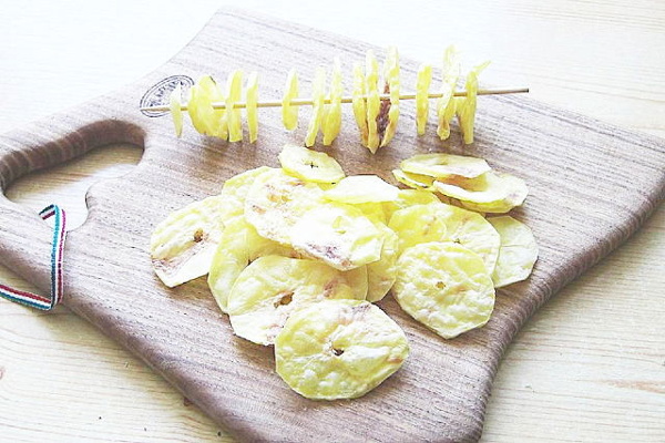 Sind die Kartoffelscheiben knusprig genug, herausnehmen und von den Stäbchen befreien.