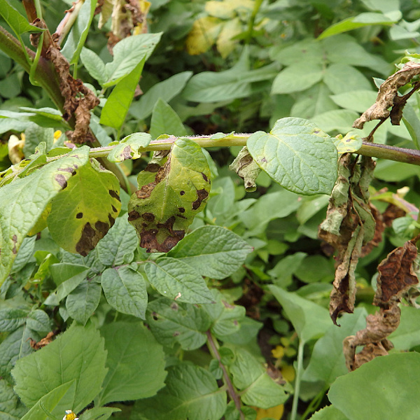Die Kraut- und Knollenfäule ist eine gefürchtete Pilzerkrankung der Kartoffel. Der Pilz, der diese Krankheit verursacht, heißt „Phytophthora infestans“. Befällt er die Pflanze, bilden sich gelbe Flecken auf den Blättern, die später braun werden. Innerhalb kürzester Zeit breitet sich die Krankheit aus und die ganze Pflanze sieht wie vertrocknet aus. Aber nicht nur die Blätter, auch die Stängel und Knollen werden vom Pilz befallen. Besonders in feuchten Jahren verursacht der Pilz Schäden an den Kartoffelpflanzen.