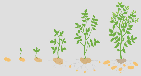 An deren Enden bilden sich Verdickungen, die im Laufe des Frühjahrs und Sommers zu Sprossknollen, den Kartoffeln, heranwachsen.