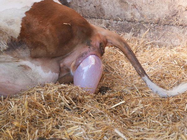 Hier seht ihr, wie sich die Geburt ankündigt. Die Fruchtblase kommt zum Vorschein und auch die Vorderfüße des Kalbes sind in der Fruchtblase schon zu erkennen.