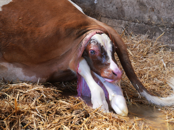 Nun ist die Fruchtblase geplatzt und die Wehen pressen das Kalb aus dem Geburtskanal. Wenn der Kopf heraus ist, haben es Kalb und Kuh schon fast geschafft. Der Kopf des Kalbes hat den größten Umfang und weitet den Geburtskanal, der Körper „flutscht“ dann schneller hinterher.