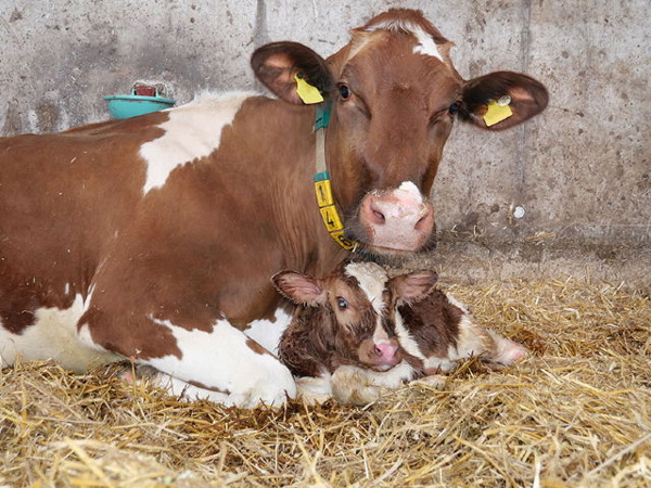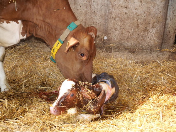 Ist das Kalb auf der Welt, leckt die Kuh es ab. Sie leckt es trocken und massiert es mit ihrer kräftigen rauen Zunge. So wird der Kreislauf des Kalbes angeregt.