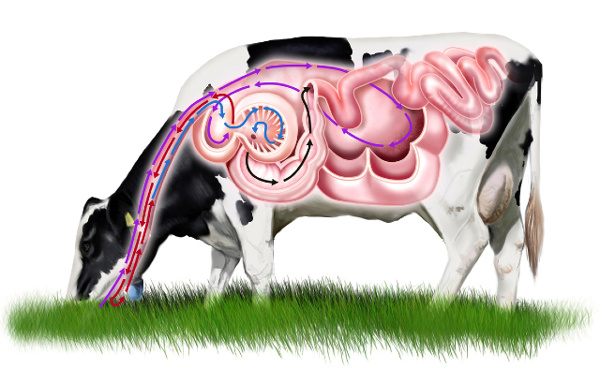Die Verdauungsorgane eines Wiederkäuers (z.B. Rind, Schaf, Ziege, Reh) sind völlig anders aufgebaut als die Verdauungsorgane eines Menschen oder eines Schweins. Ihre Funktionen sind erstaunlich und ermöglichen es der Kuh, selbst Futtermittel wie Stroh zu verdauen.