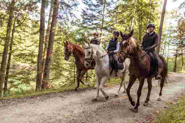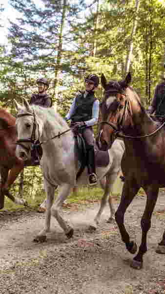 Reitet ihr in der Gruppe: Reitet hintereinander, nicht nebeneinander.
